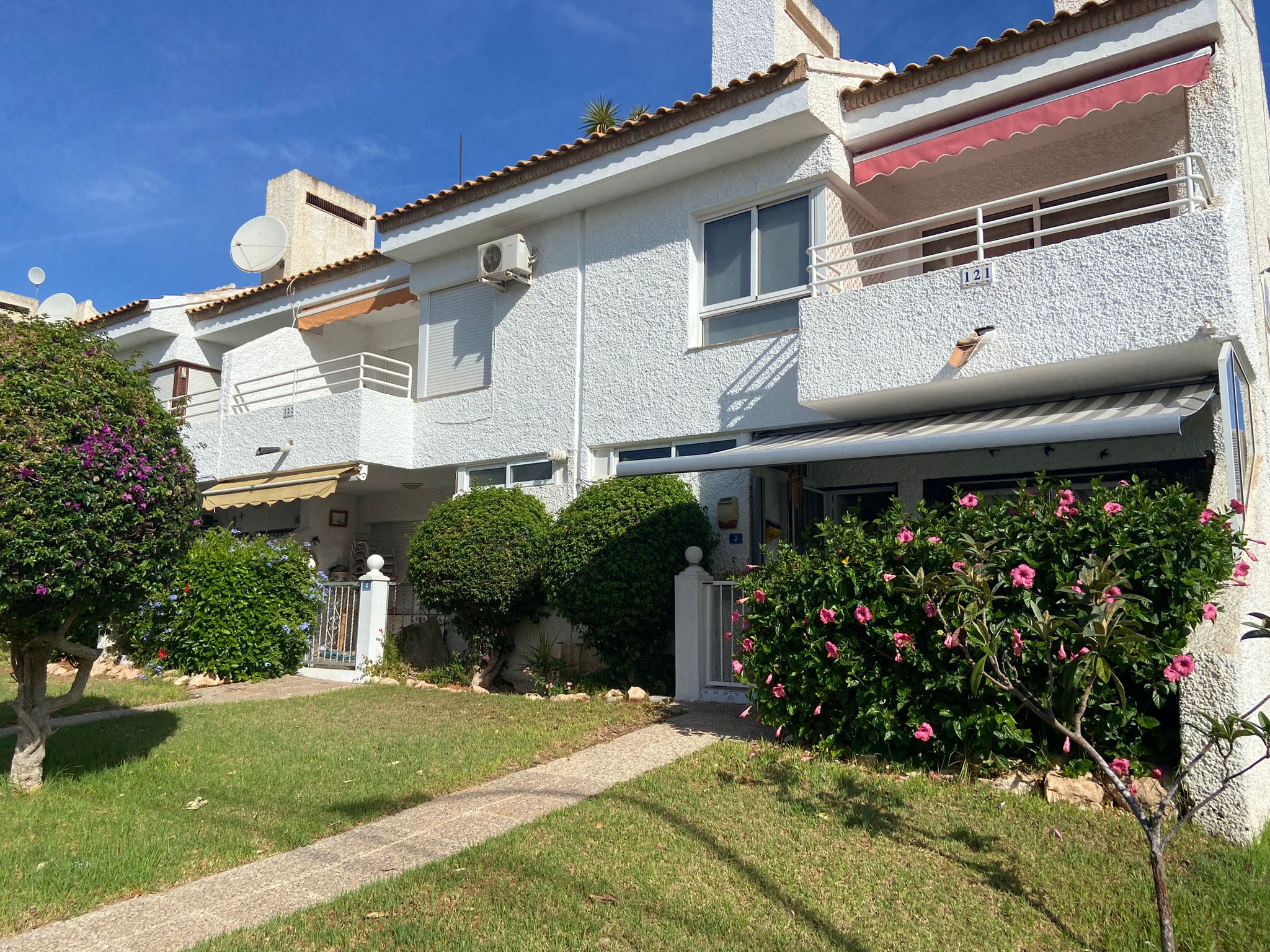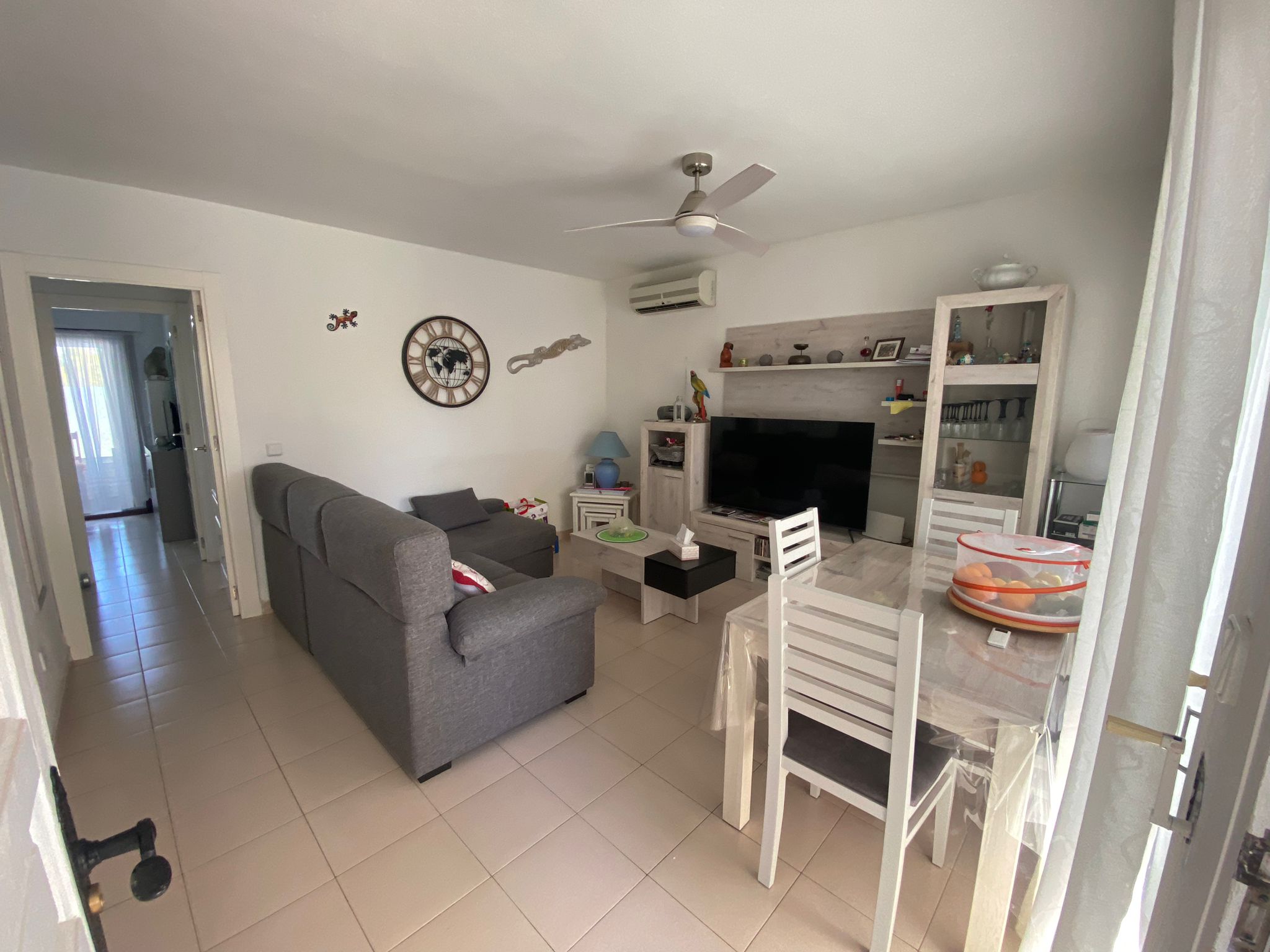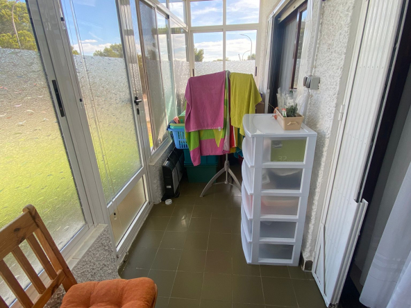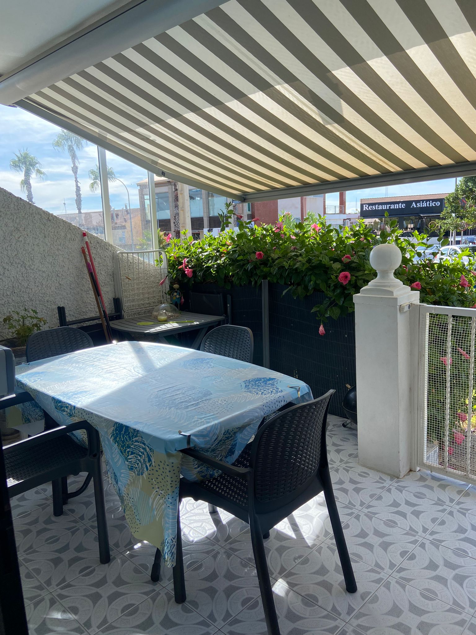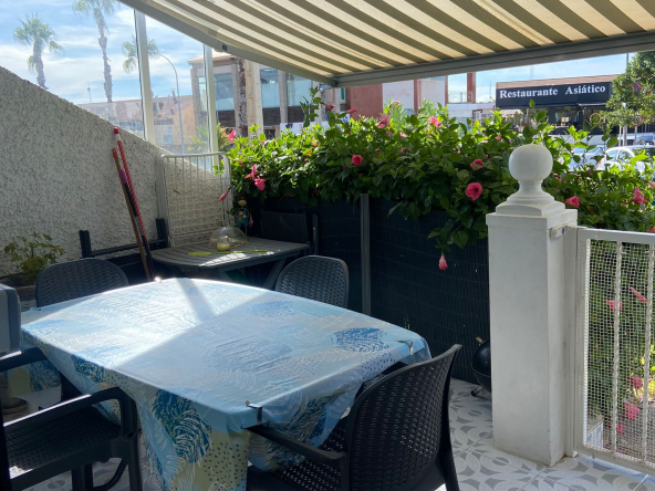 Vivienda de planta baja de 3 frentes y esquina – salón amueblado – aire acondicionado y ventiladores – cocina equipada con nevera – horno eléctrico – vitrocerámica – lavadero con lavadora – caldera – nevera y mueble de almacenamiento – WC con ducha y lavabo – dormitorio amueblado con aire acondicionado y ventilador – segundo dormitorio amueblado con ventilador – terraza trasera acristalada con puerta que da al césped comunitario – terraza delantera cubierta con toldo solar eléctrico que también da al césped – piscina comunitaria.