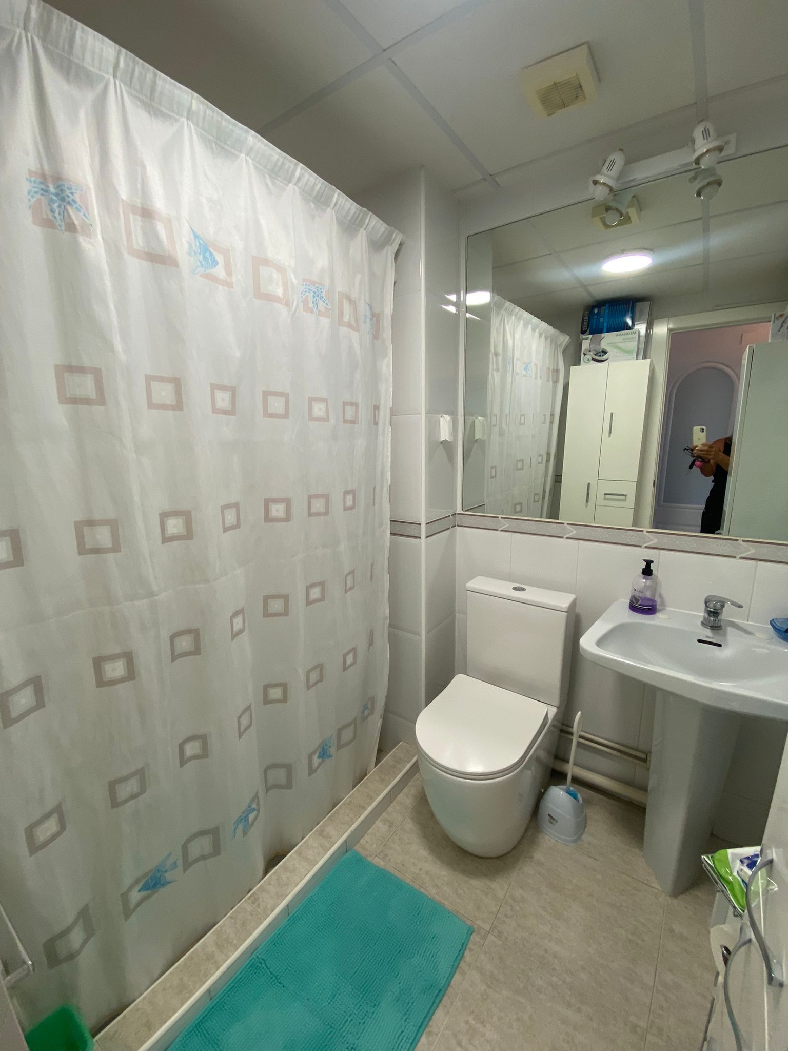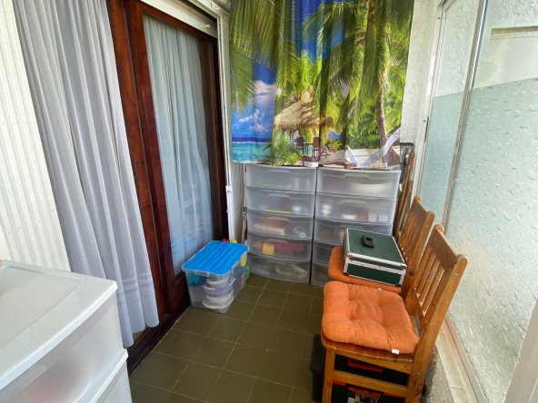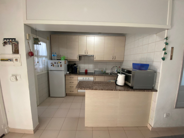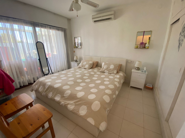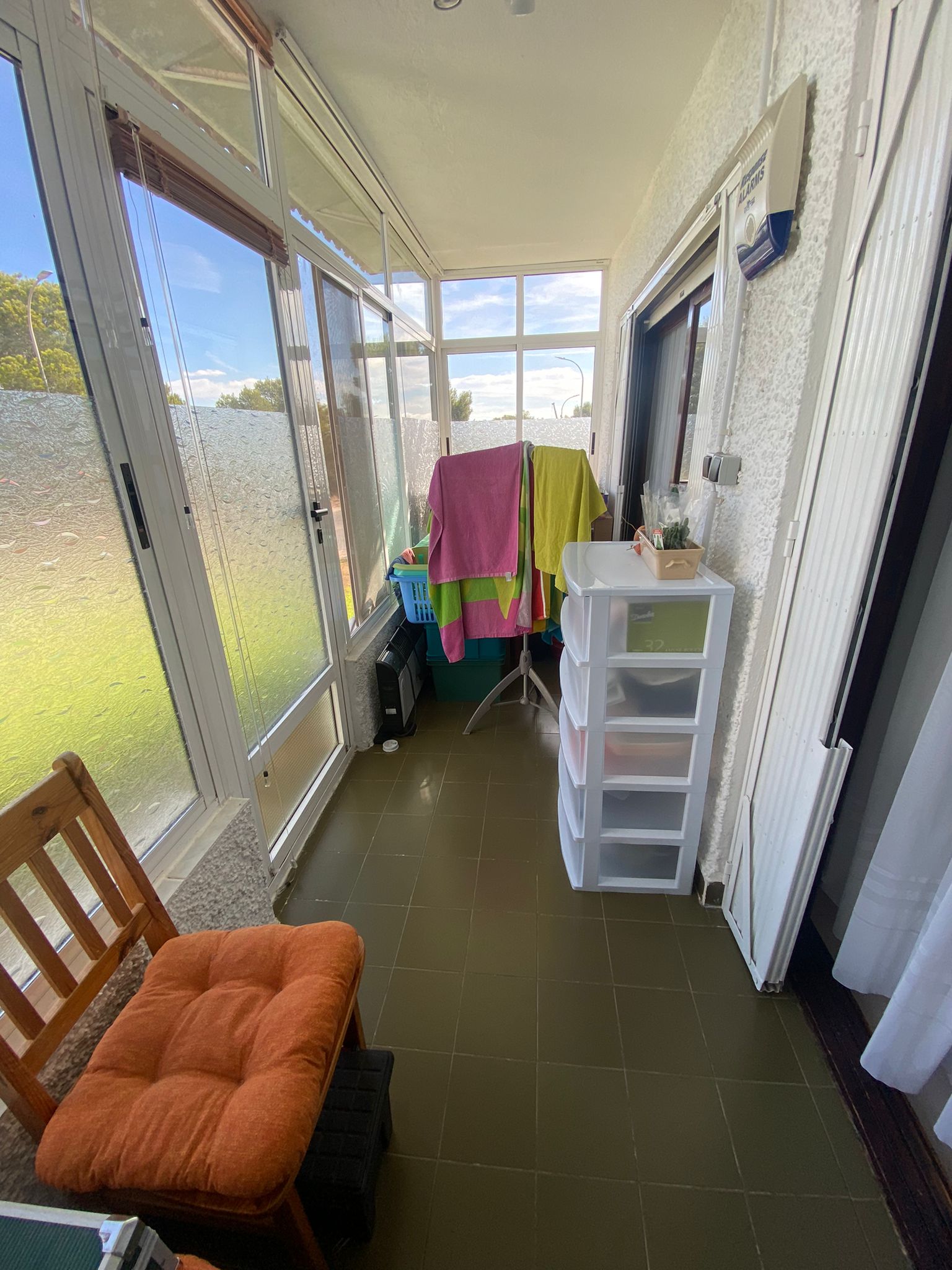 Vivienda de planta baja de 3 frentes y esquina – salón amueblado – aire acondicionado y ventiladores – cocina equipada con nevera – horno eléctrico – vitrocerámica – lavadero con lavadora – caldera – nevera y mueble de almacenamiento – WC con ducha y lavabo – dormitorio amueblado con aire acondicionado y ventilador – segundo dormitorio amueblado con ventilador – terraza trasera acristalada con puerta que da al césped comunitario – terraza delantera cubierta con toldo solar eléctrico que también da al césped – piscina comunitaria.